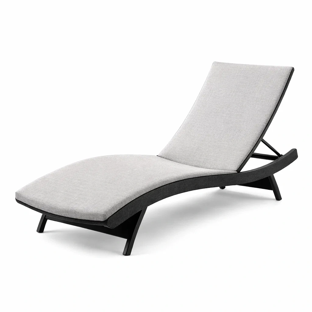Chaise longue extérieure avec une structure en aluminium recouverte d'un tissu en polyester gris. Conception ergonomique ondulée.